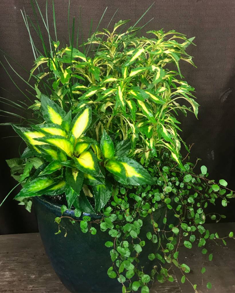Container Garden for Filtered Sun – Juncus, Coleus, Sunpatiens, Angelvine