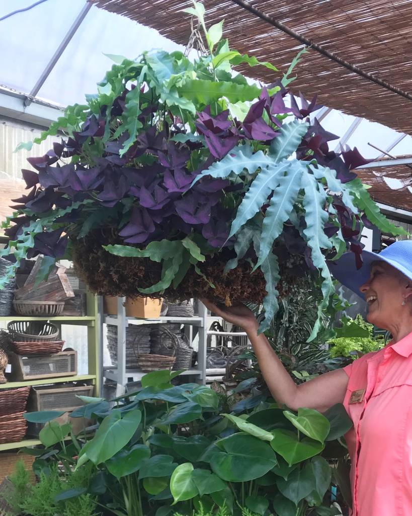 Hanging Basket In Greenhouse – Blue Crisp Fern, Purple Oxalis