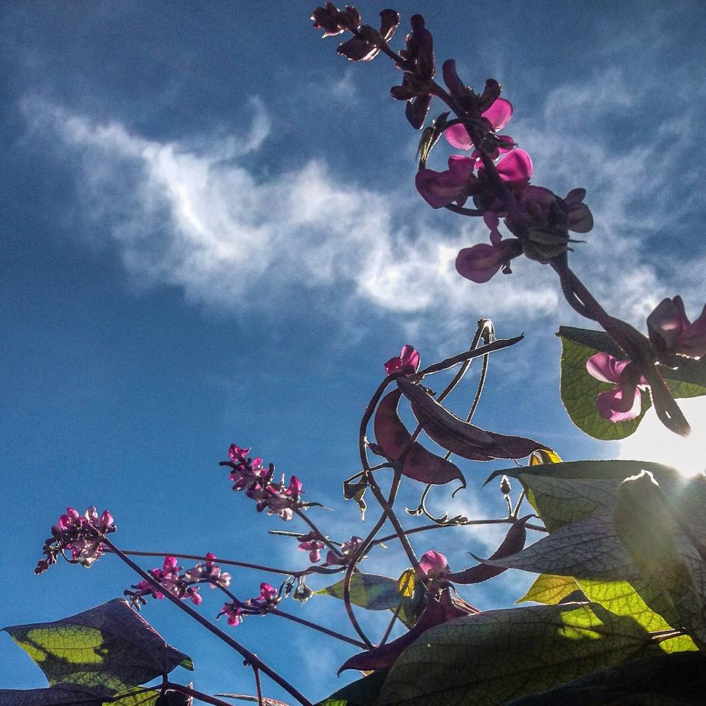 Hyacinth bean vine, sillouhetted against a blue sky…