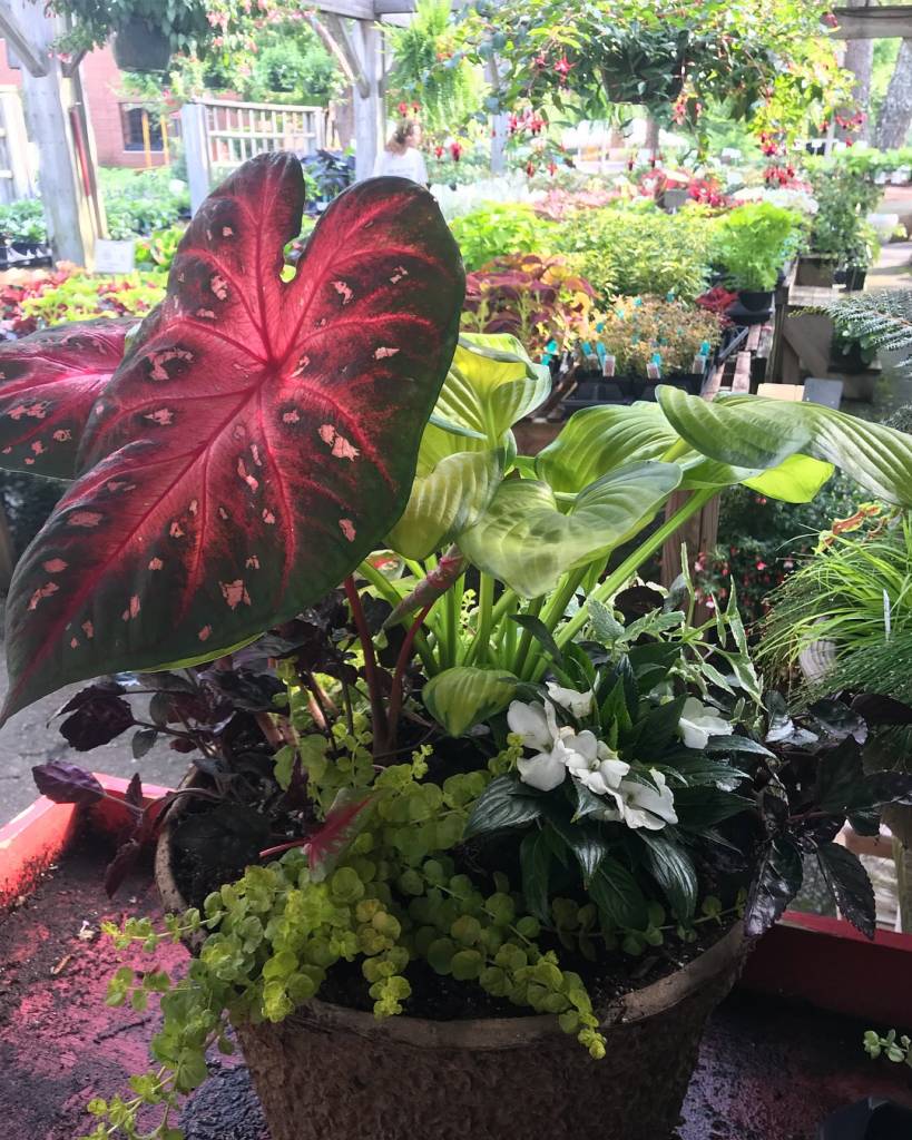 Published May 25, 2018 at 819 × 1024 in Shade Container Garden – Stained Glass Hosta, Red Flash Caladium, White Sunpatien, Creeping Jenny, Hemigraphis.