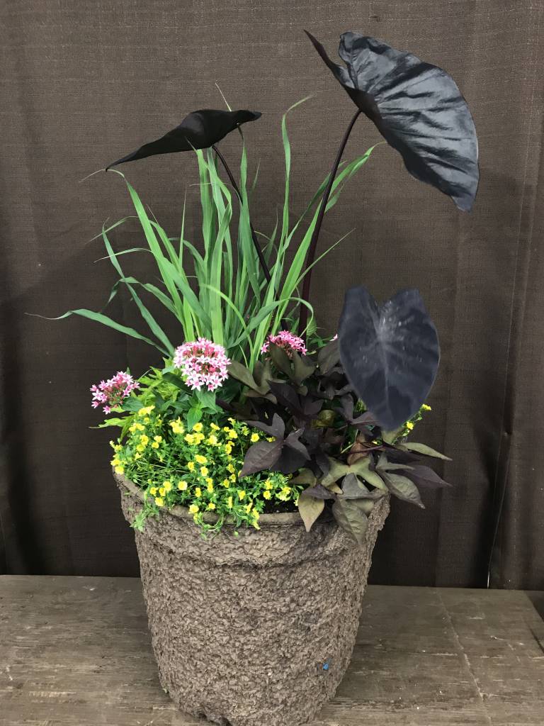 Container Garden with Black Elephant Ear, Lemon Grass and Trailing Pentas