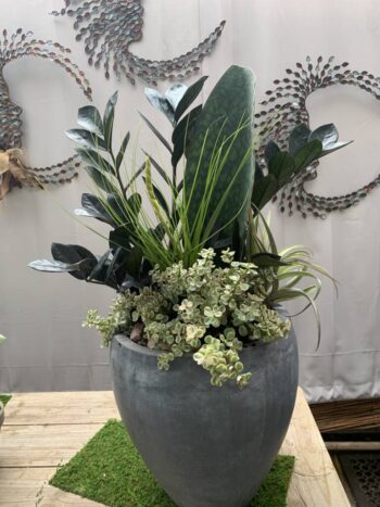 Container Planting with Whale fin sanseveria, Black Raven ZZ plant, Portulacaria and Air Plants ← Previous Next →
