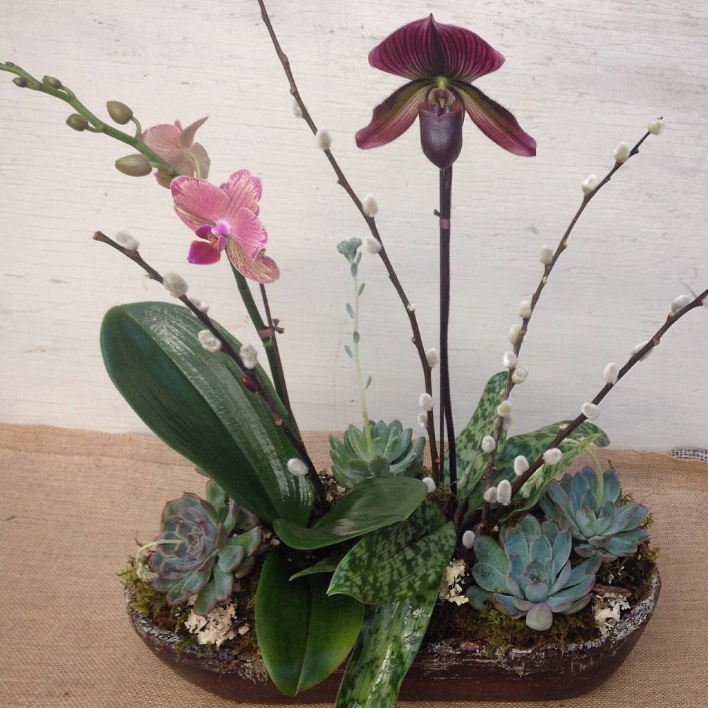 Orchid Arrangement ← Previous Next → An orchid and pussywillow arrangement with succulents at the base…