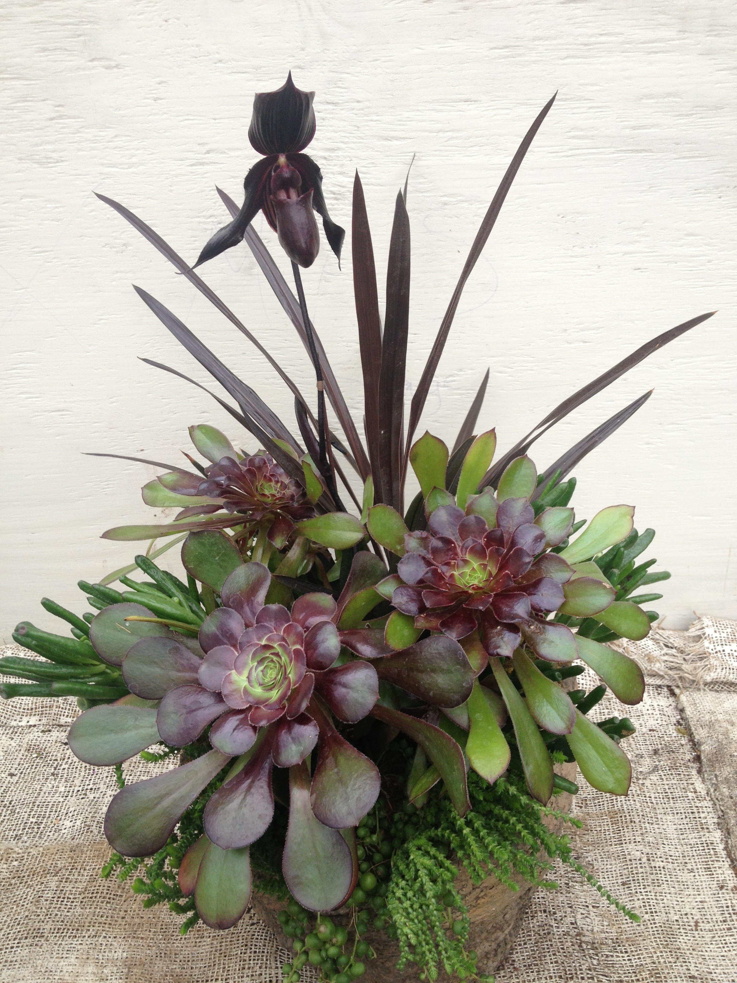 Orchid arrangement: Lady Slipper, Aeoniums, Red Cordyline and String of Pearls