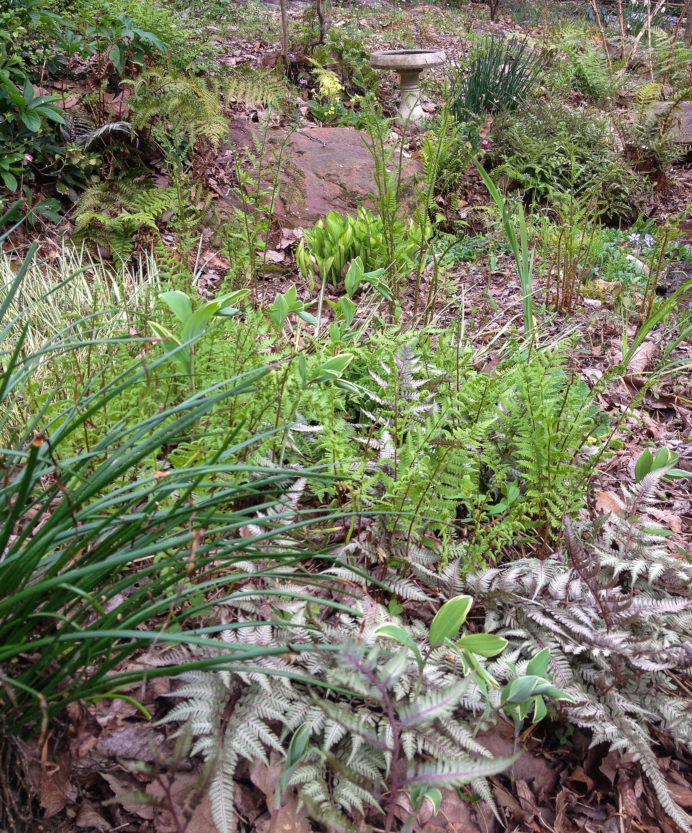 Japanese Painted and Autumn Ferns and Hostas Emerging, Early Spring
